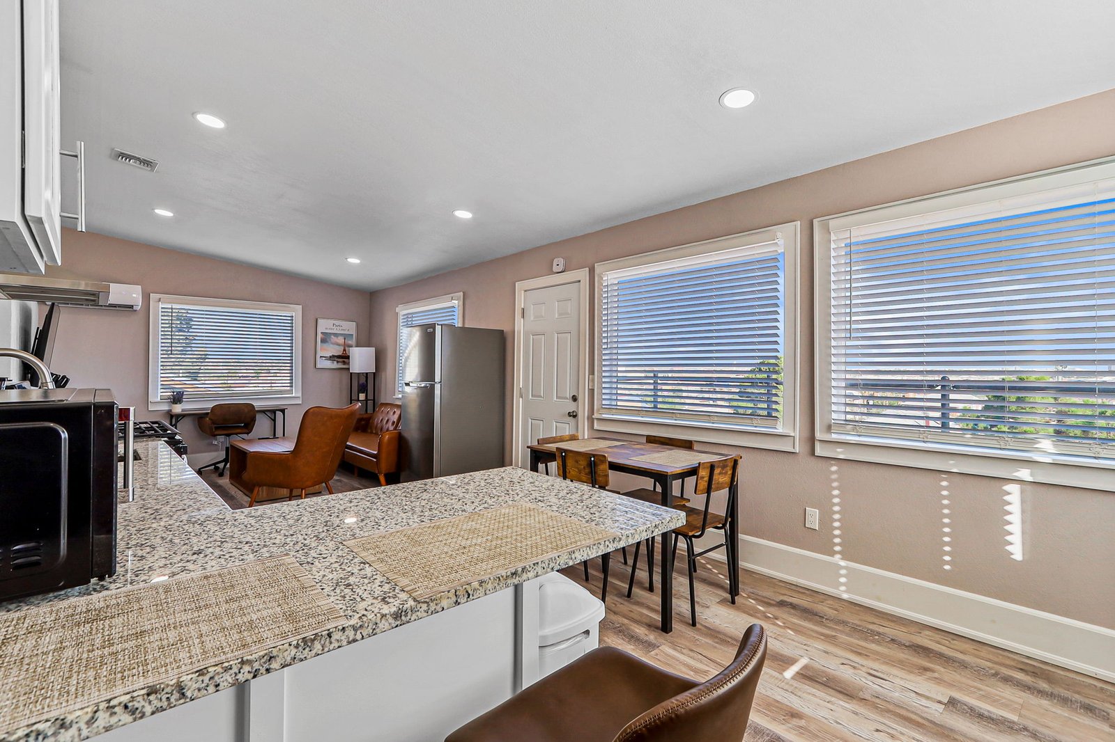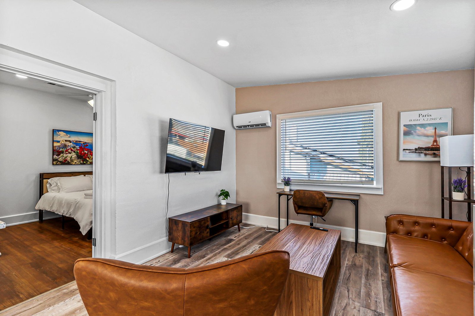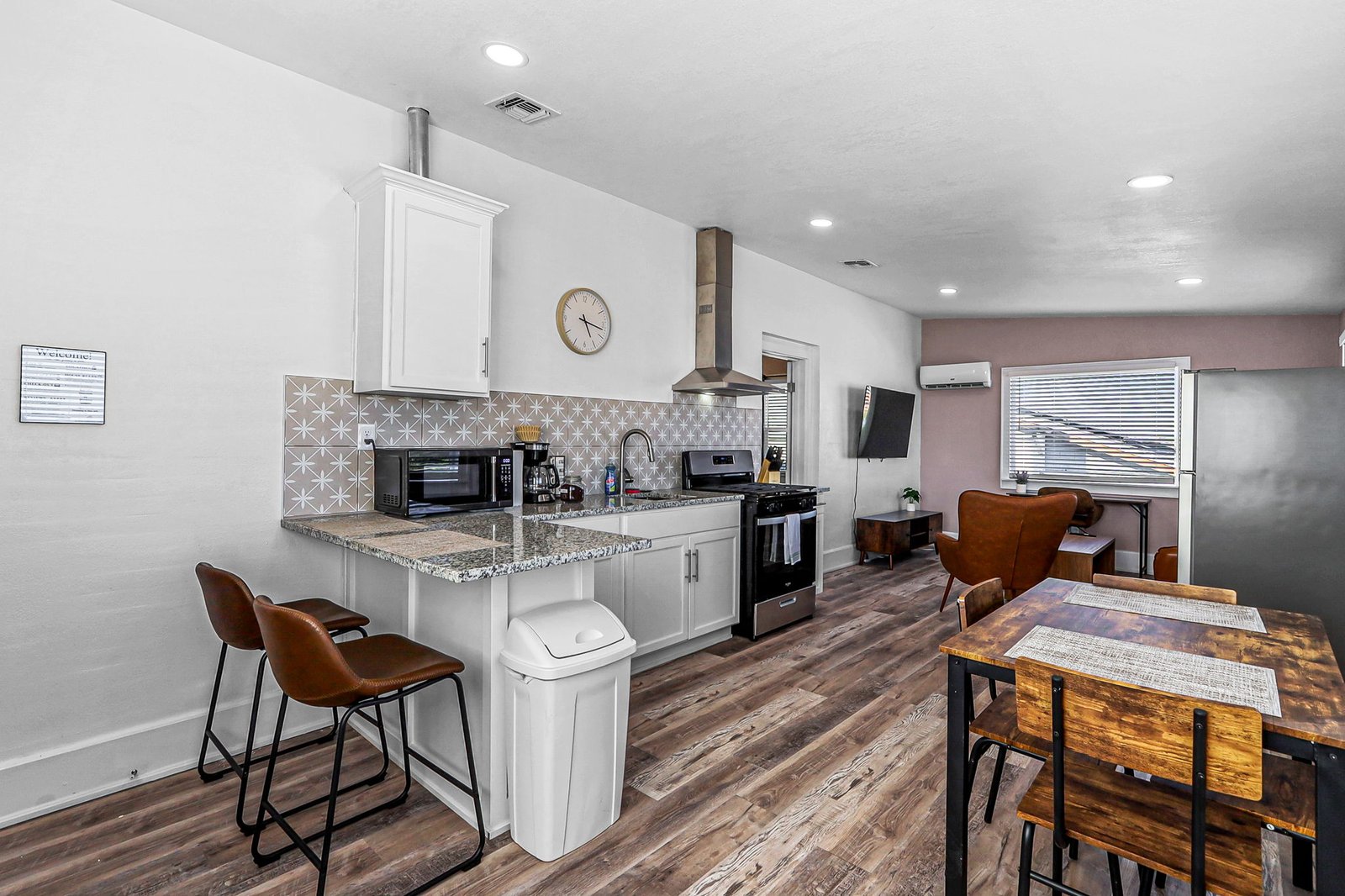 Tucked away at the back of the property, this 1-bedroom, 1-bathroom unit is perfect for solo travelers, couples, or business guests As you step! Inside, you’ll be welcomed by a bright open-concept layout. The kitchen comes stocked with everything you need to prepare home-cooked meals, while the two-seat breakfast bar and four-person dining area by the window make mealtime a delight.