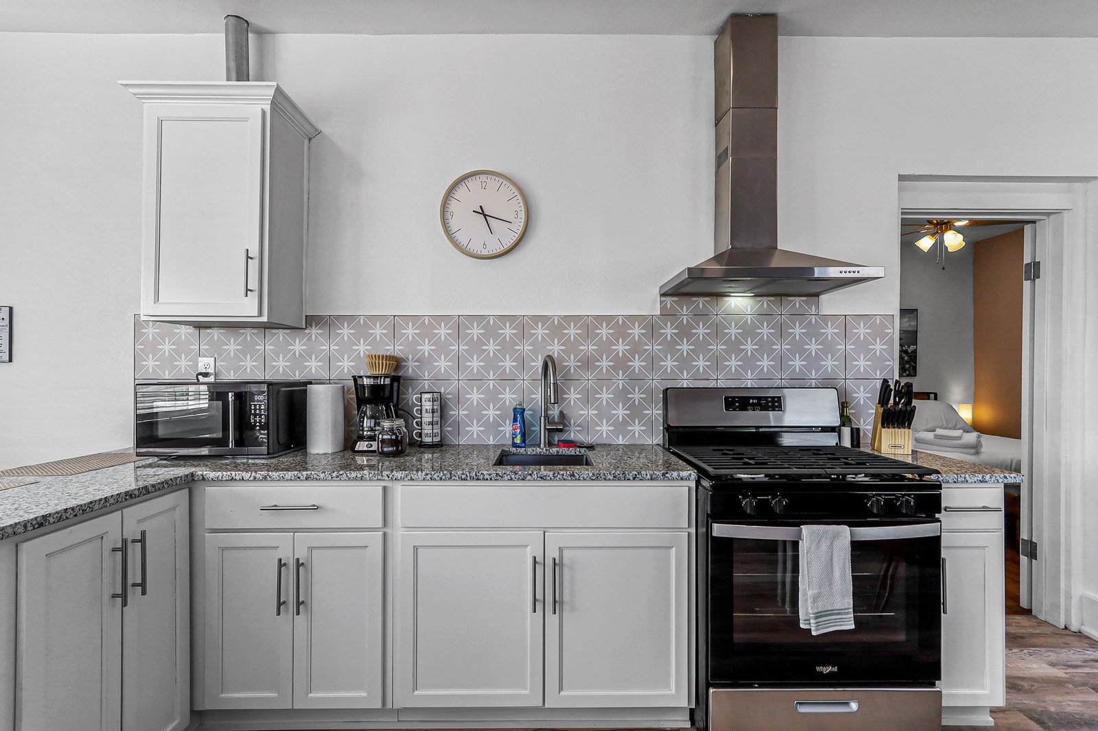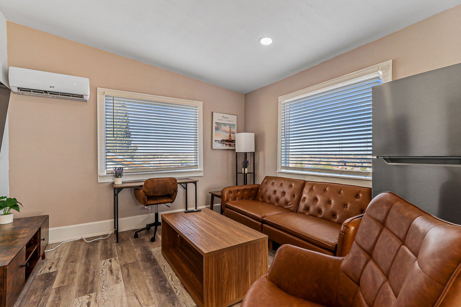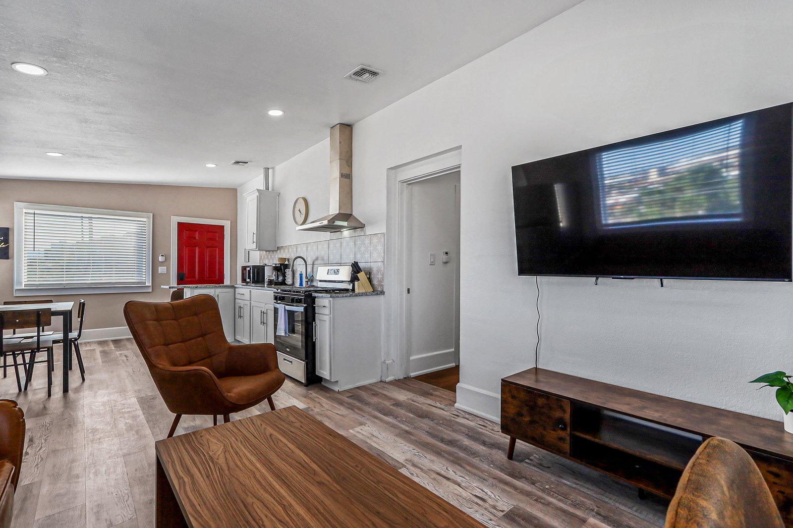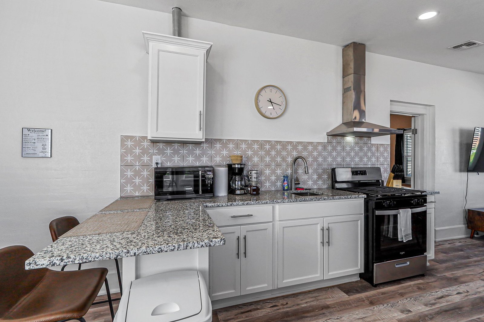 Tucked away at the back of the property, this 1-bedroom, 1-bathroom unit is perfect for solo travelers, couples, or business guests As you step! Inside, you’ll be welcomed by a bright open-concept layout. The kitchen comes stocked with everything you need to prepare home-cooked meals, while the two-seat breakfast bar and four-person dining area by the window make mealtime a delight.