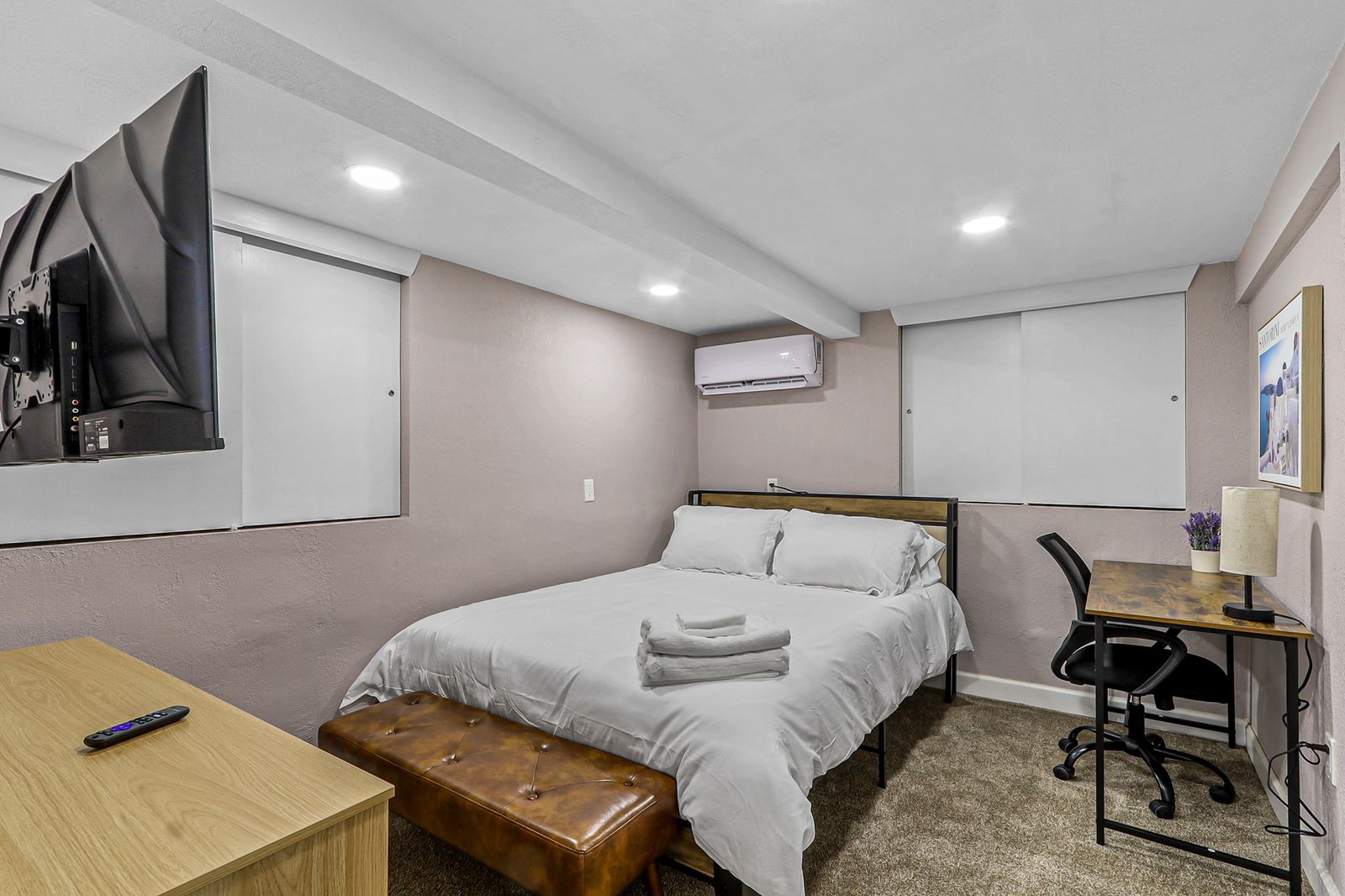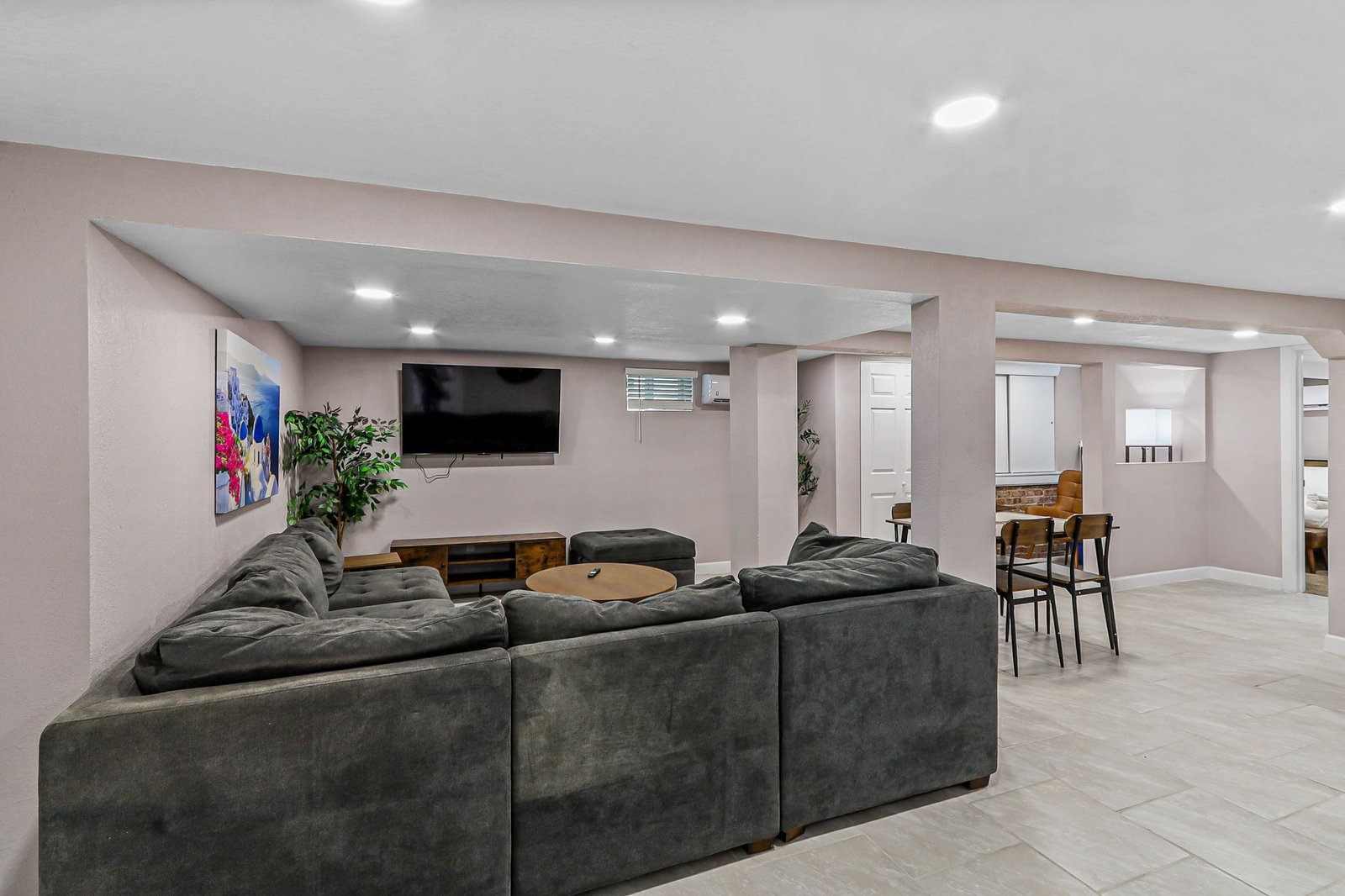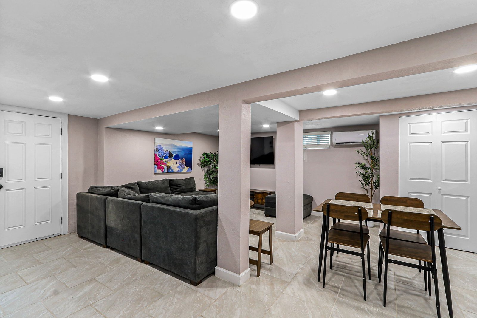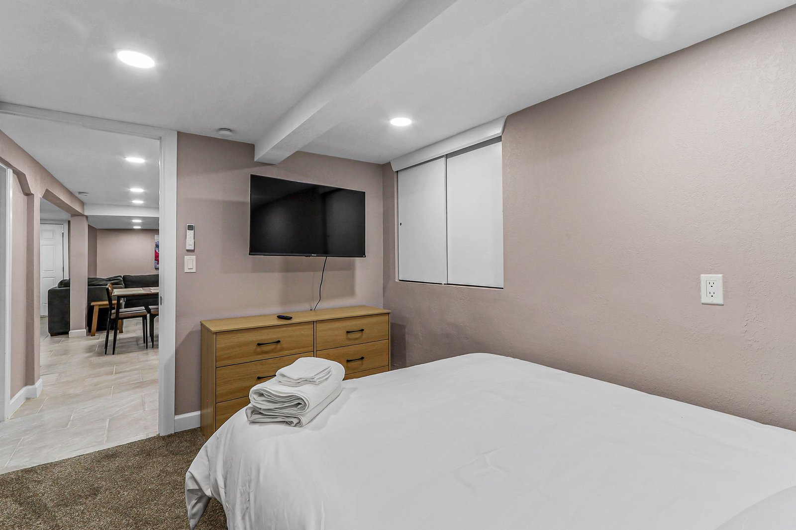 This 2-bedroom, 2-bathroom “basement” unit offers the perfect balance of comfort and functionality for families, friends, or business travelers. Step inside to an open-concept living space, complete with a large L-shaped sofa and a 58″ Smart TV, ideal for cozy evenings or catching up on your favorite shows. A mini-split system ensures a comfortable atmosphere no matter the season!