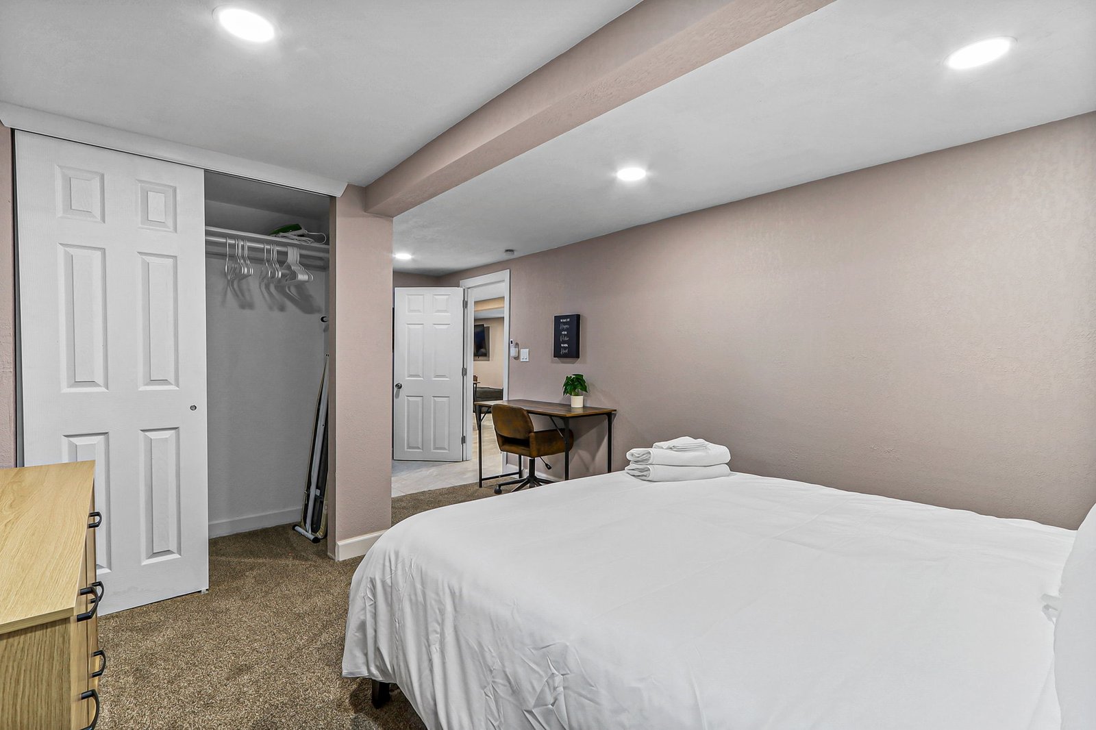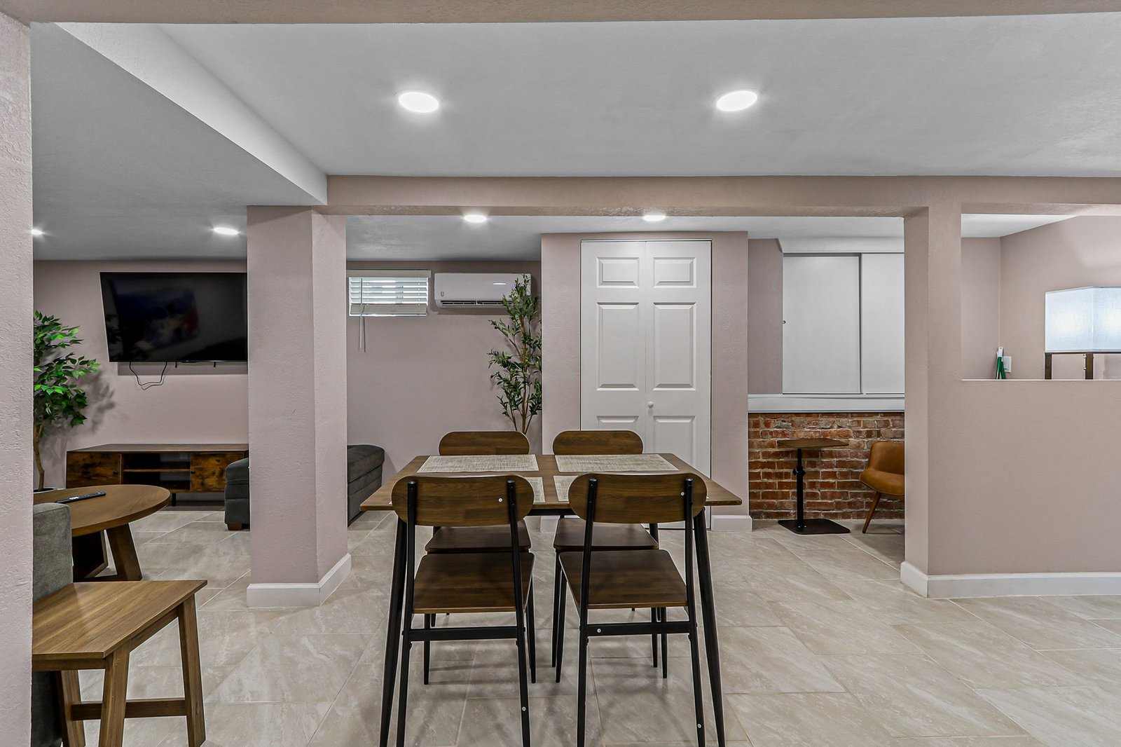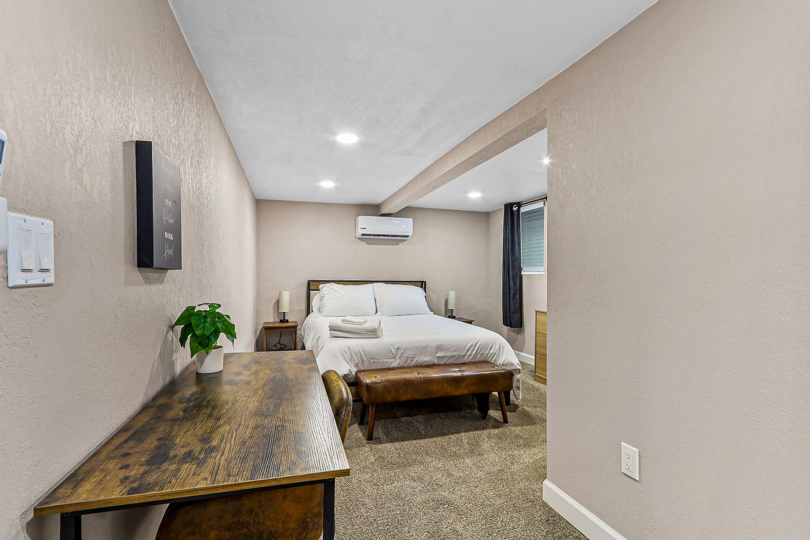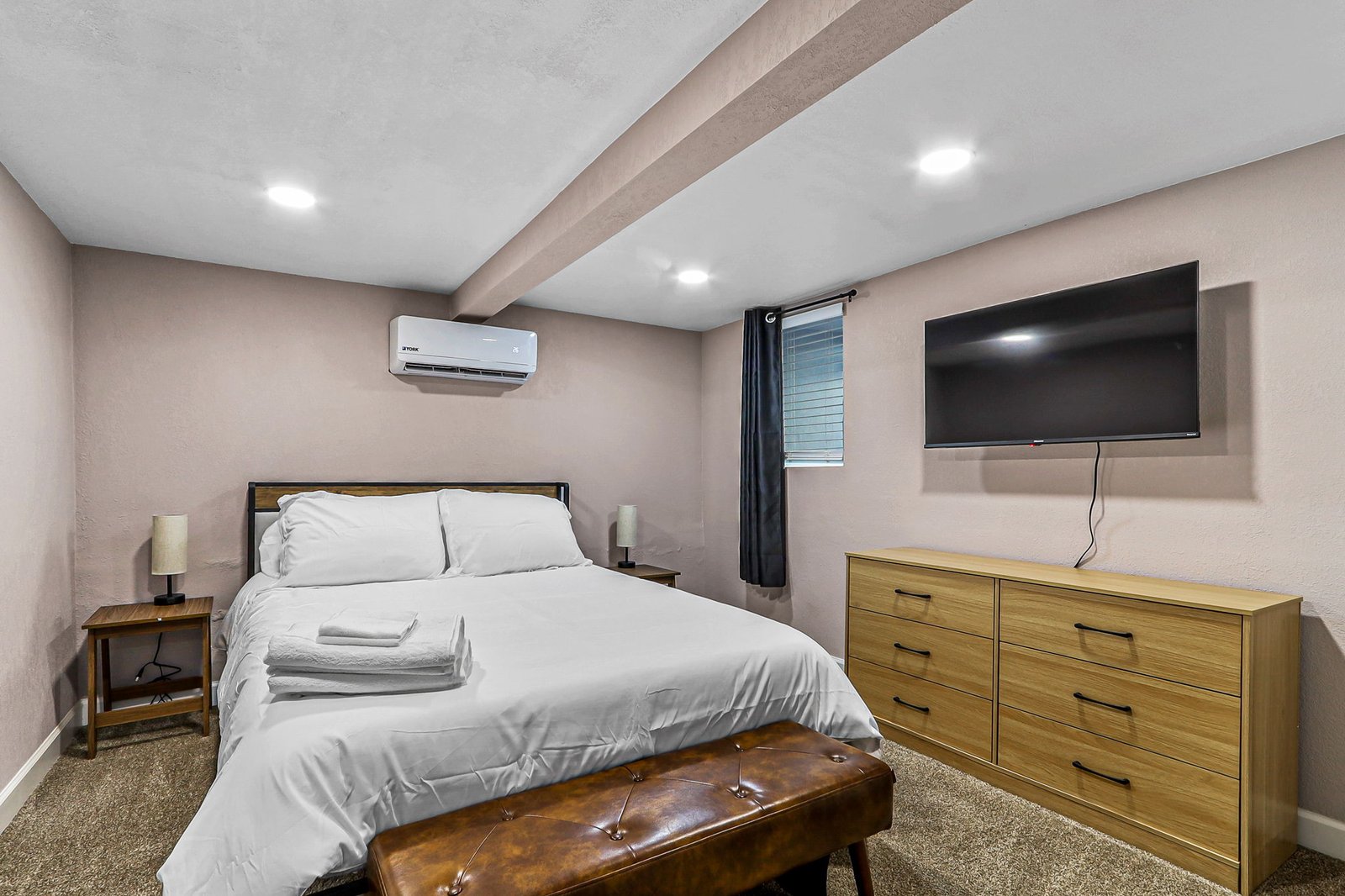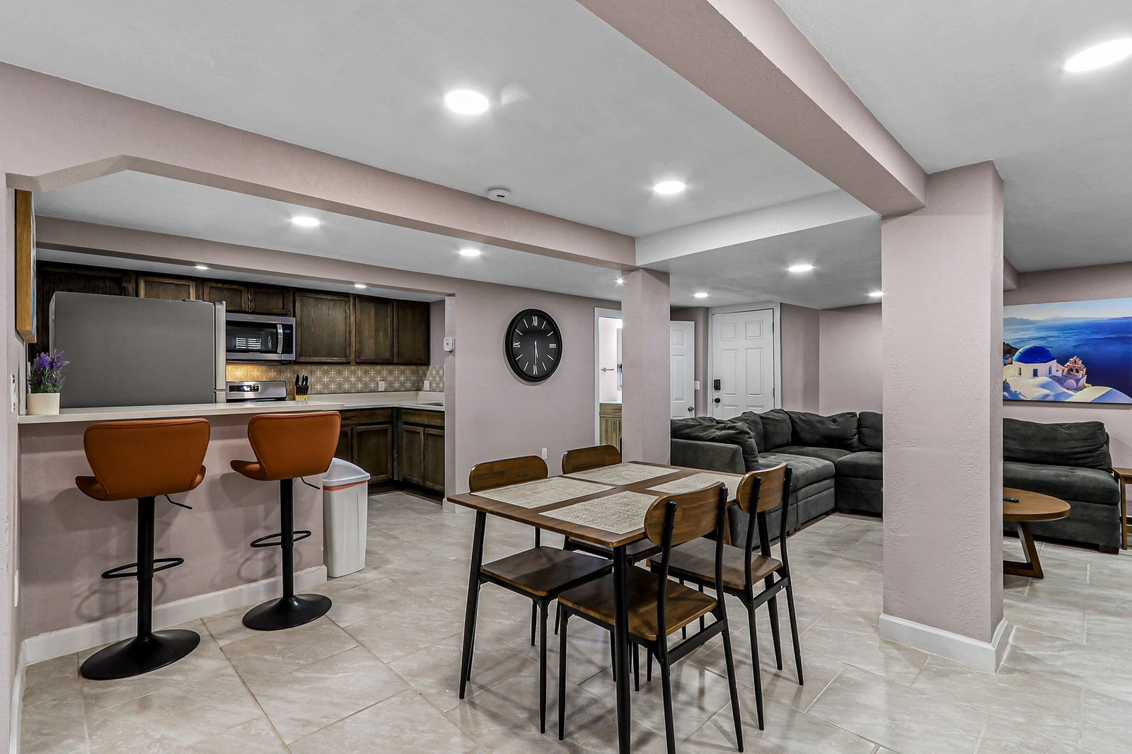 This 2-bedroom, 2-bathroom “basement” unit offers the perfect balance of comfort and functionality for families, friends, or business travelers. Step inside to an open-concept living space, complete with a large L-shaped sofa and a 58″ Smart TV, ideal for cozy evenings or catching up on your favorite shows. A mini-split system ensures a comfortable atmosphere no matter the season!
