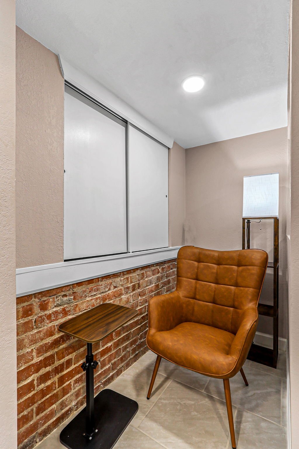 Just off the dining space, a small reading nook with a chair and table creates a quiet spot for an afternoon book or a remote work session. Behind a sliding door, you’ll find your private washer and dryer, available for your exclusive use during your stay.