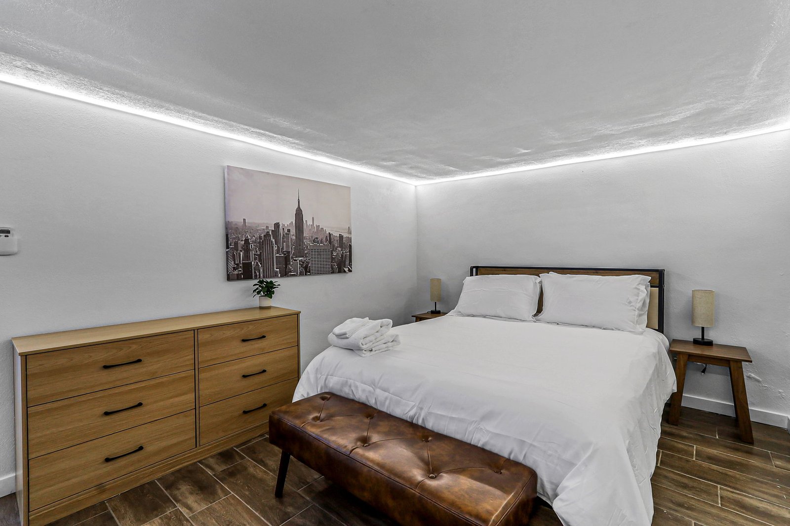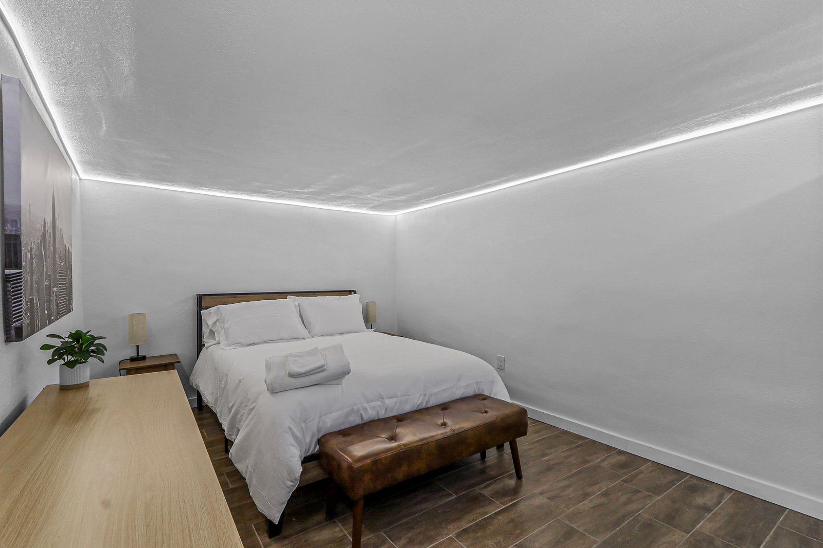 Heading down the stairs, the basement bedroom offers a comfortable queen-size bed, good lighting, and a closet and dresser so you can easily store clothes and personal belongings. A small window with blackout curtains lets you control the natural light, and a dedicated workspace makes it convenient for work-from-home days. The mini split system ensures a comfortable stay in every season!