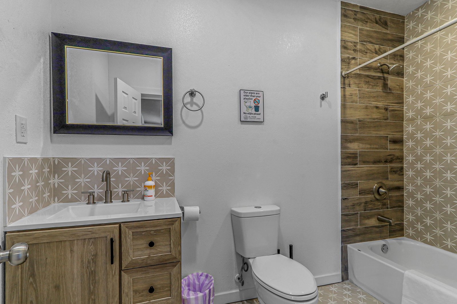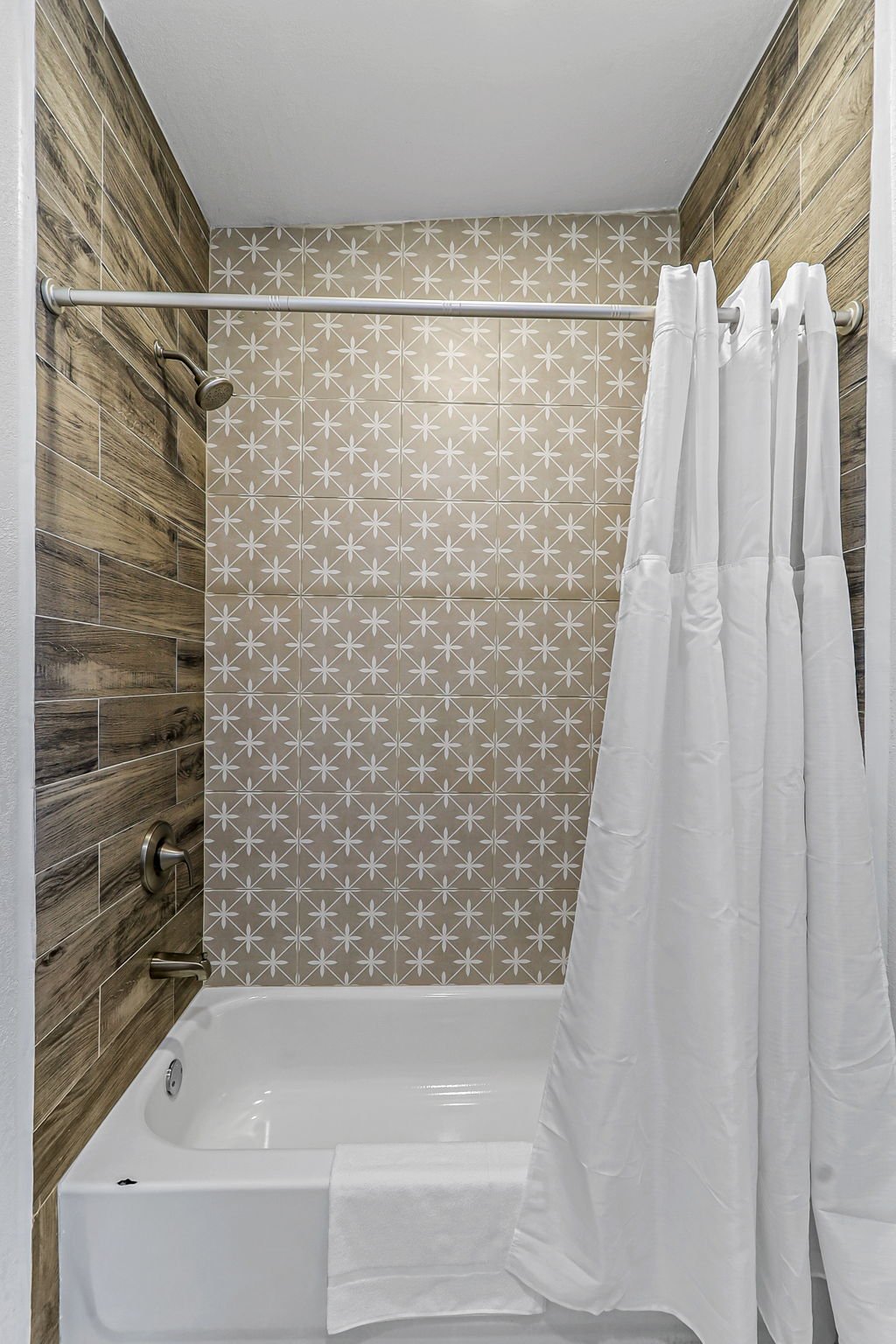 The full bathroom, located near the entrance, includes a comfortable bathtub for unwinding after a long day, along with essentials from our starter kit.