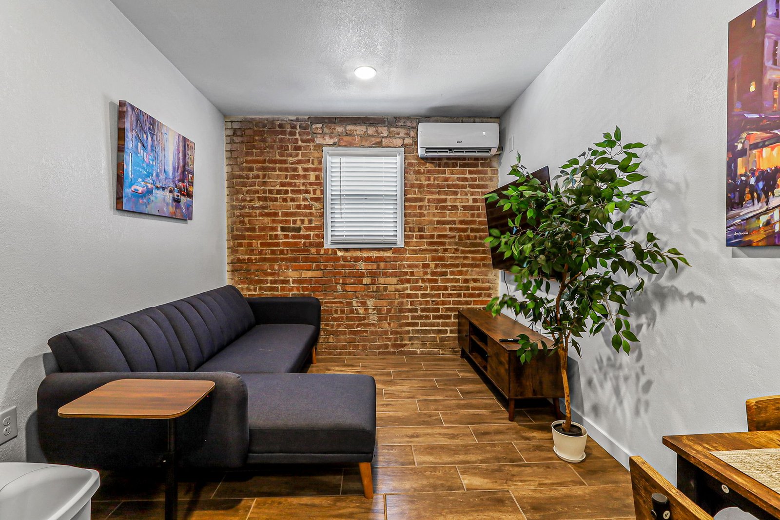 At the end of the space, the cozy living room features an L-shaped sofa, a 58″ Smart TV, and a mini split system to keep the temperature just right.